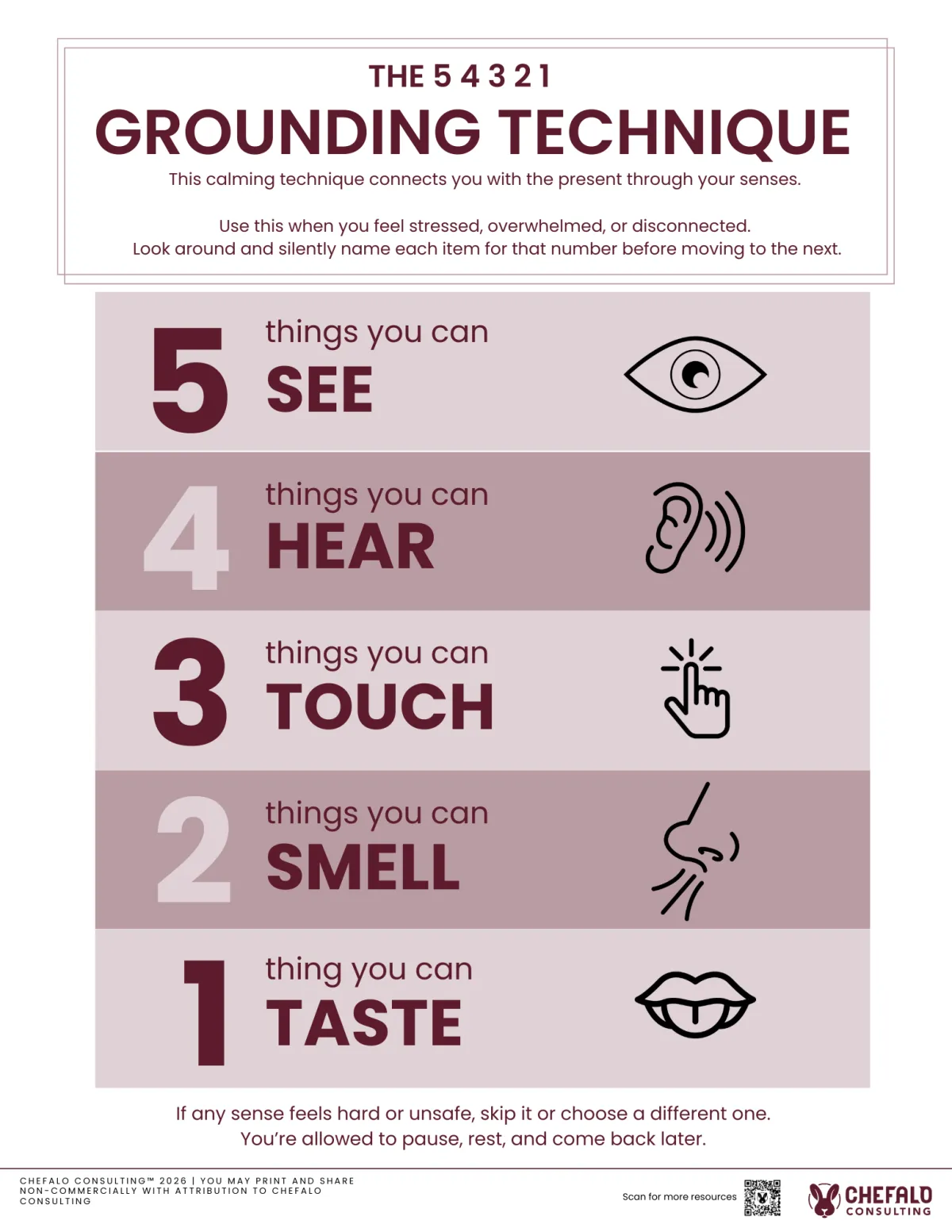 This free download includes a printable, sensory-based grounding poster designed to support real-time regulation using sight, sound, touch, smell, and taste.