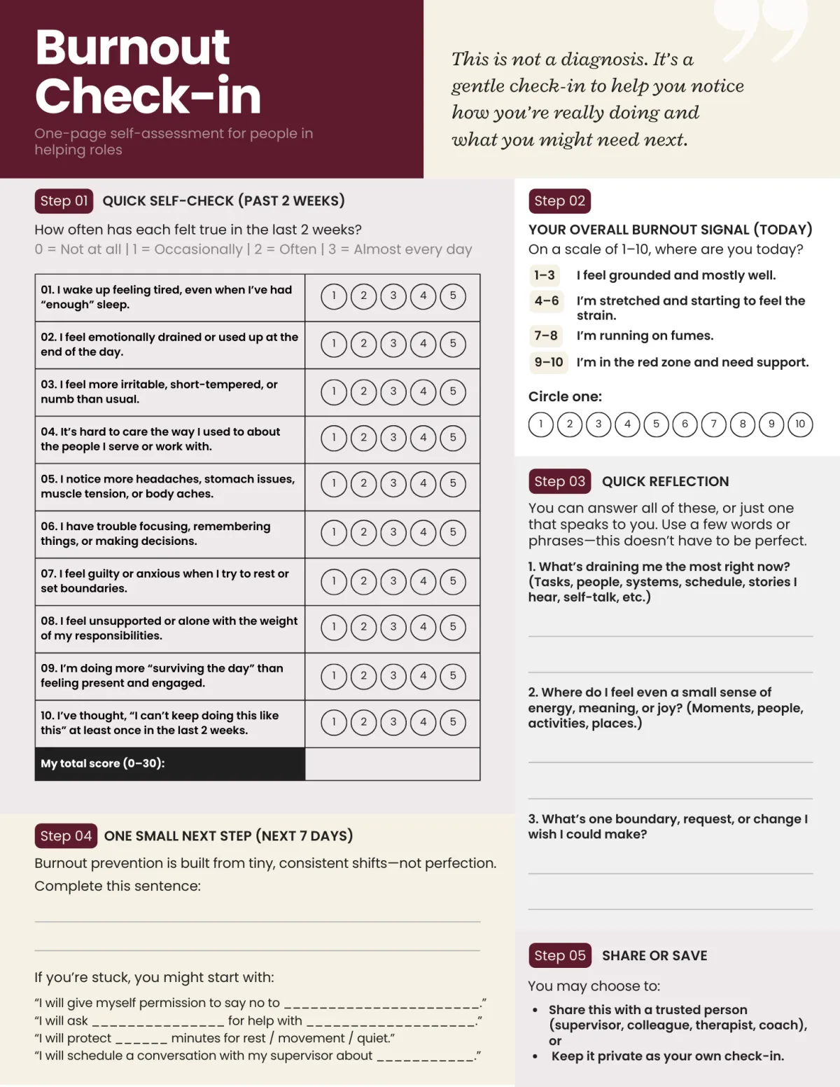 You can use it on your own as a regular practice, bring it to supervision or coaching conversations, or share it with colleagues who might also be feeling stretched. It works whether you're in crisis or just starting to feel the strain. The reflection prompts help you identify patterns you might not have noticed, and the next-step planning keeps it grounded in what's actually possible - not what "should" be possible.