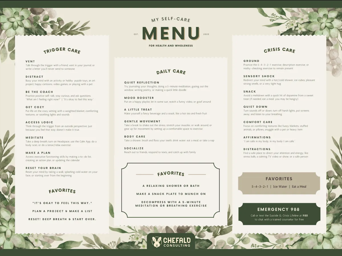 Our Self-Care Menu gives you options—not obligations. It's designed to meet you where you are, whether you need a small daily practice, support through a difficult moment, or tools for navigating crisis. And because it's structured like a menu, you can choose what fits right now. One thing. Two things. Whatever you need.